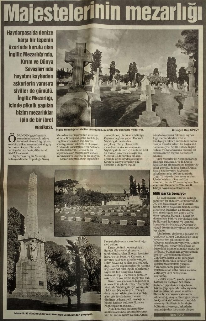 Majestelerinin mezarlığı başlıklı, 2000 yılına ait bir gazete sayfası. Şöyle devam ediyor: “Haydarpaşa’da denize karşı bir tepenin üzerinde kurulu olan İngiliz Mezarlığı’nda Kırım ve Dünya Savaşları’nda hayatını kaybeden askerlerin yanısıra siviller de gömülü. Haydarpaşa İngiliz Mezarlığı, içinde piknik yapılan bizim mezarlıklar için de bir ibret vesikası.”