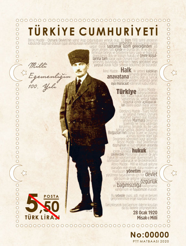 Ayrıca, 28 Ocak- 06 Şubat 2020 tarihleri arasında gerçekleşecek Milli Mücadelenin 100. Yılı (Misak-ı Milli) konulu pul sergi alanında 2020 Milli Mücadelenin 100. Yılı (Misak-ı Milli) Pul Sergisi 28.01-06.02.2020 İstanbul ibareli özel tarih damgası kullandırılacak.