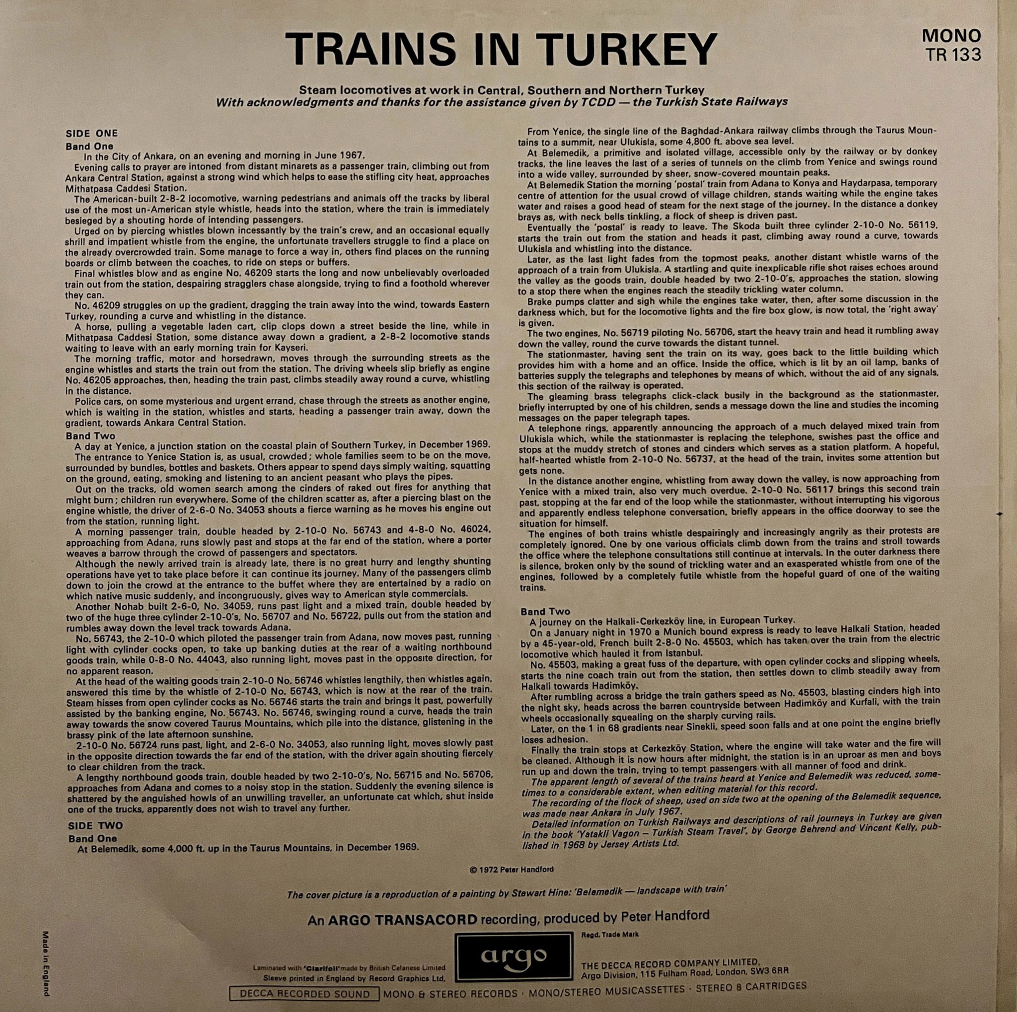 Türkiye’deki tren seslerinin 1970’lerde bir plakta kayıt altına alındığını biliyor muydunuz? Demiryolları seslerini kayıt eden Argo Transacord şirketi tarafından yayınlanan Trains in Turkey plağını, bir koleksiyonerin paylaşımı sayesinde öğreniyoruz.