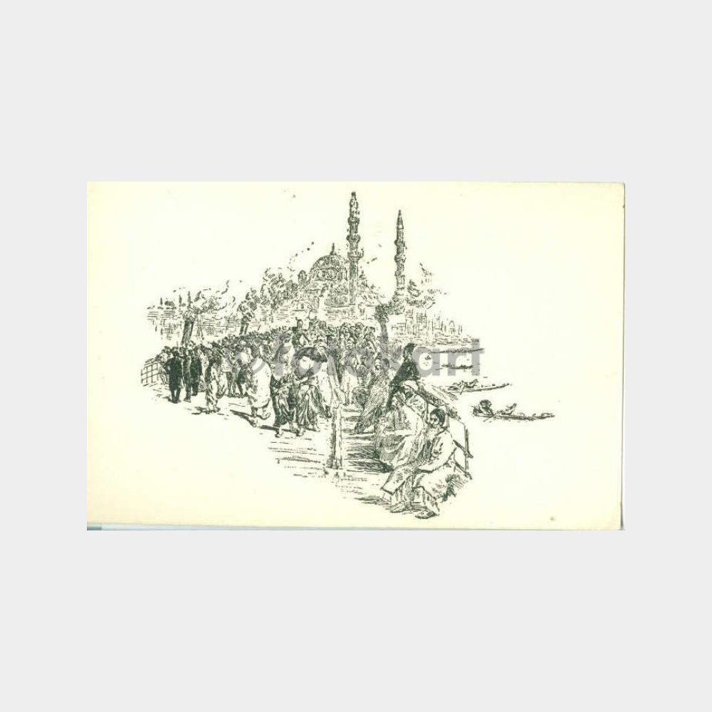 Ünlü İtalyan illüstratör Cesare Biseo’nun (1843-1909) desenlerinden alınma kartpostal. İstanbul Yayınevi, Güzelişi Basımevi Konu : Galata Köprü Üzeri -1870