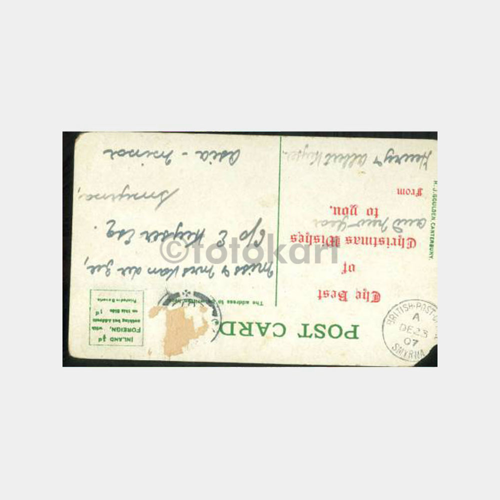 Arkasında miss ve mrs van der zee c/o e.kayser esQ. smyrne adresli yılbaşı tebrik kartı- üst köşede 23.12.1907 smyrne british post office damgası var