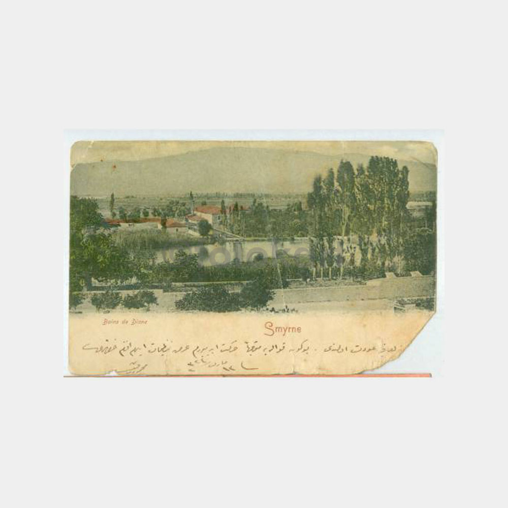 Hayli yorgun durumda kartpostal ancak üzerinde iki farklı İzmir posta damgası var, 1.Damga sıyrılmış pul üzerinde şerit çizgi şeklinde ve alt kısmında symrne yazılı damga*nadirdir 2.Damga kartın orta yerinde klasik daire posta damgası şeklindedir