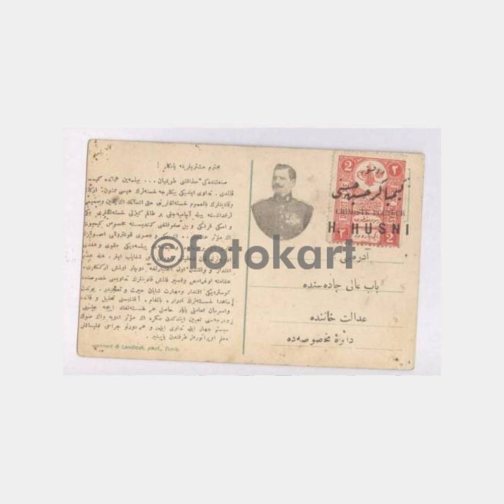 Karın ön yüzünde Tunus’un Sayfiye şehri Sidi-Bou-Said görünüşü, arka yüzünde pul üzerinde Chimiste Docteur H. Husnı baskısı ve 2 paralık fiskal pulu