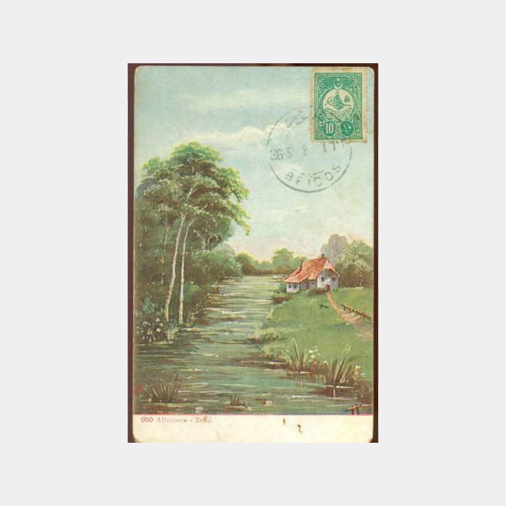Arkası yazılı Osmanlı posta damgalı köy manzaralı yabancı baskı kartpostal