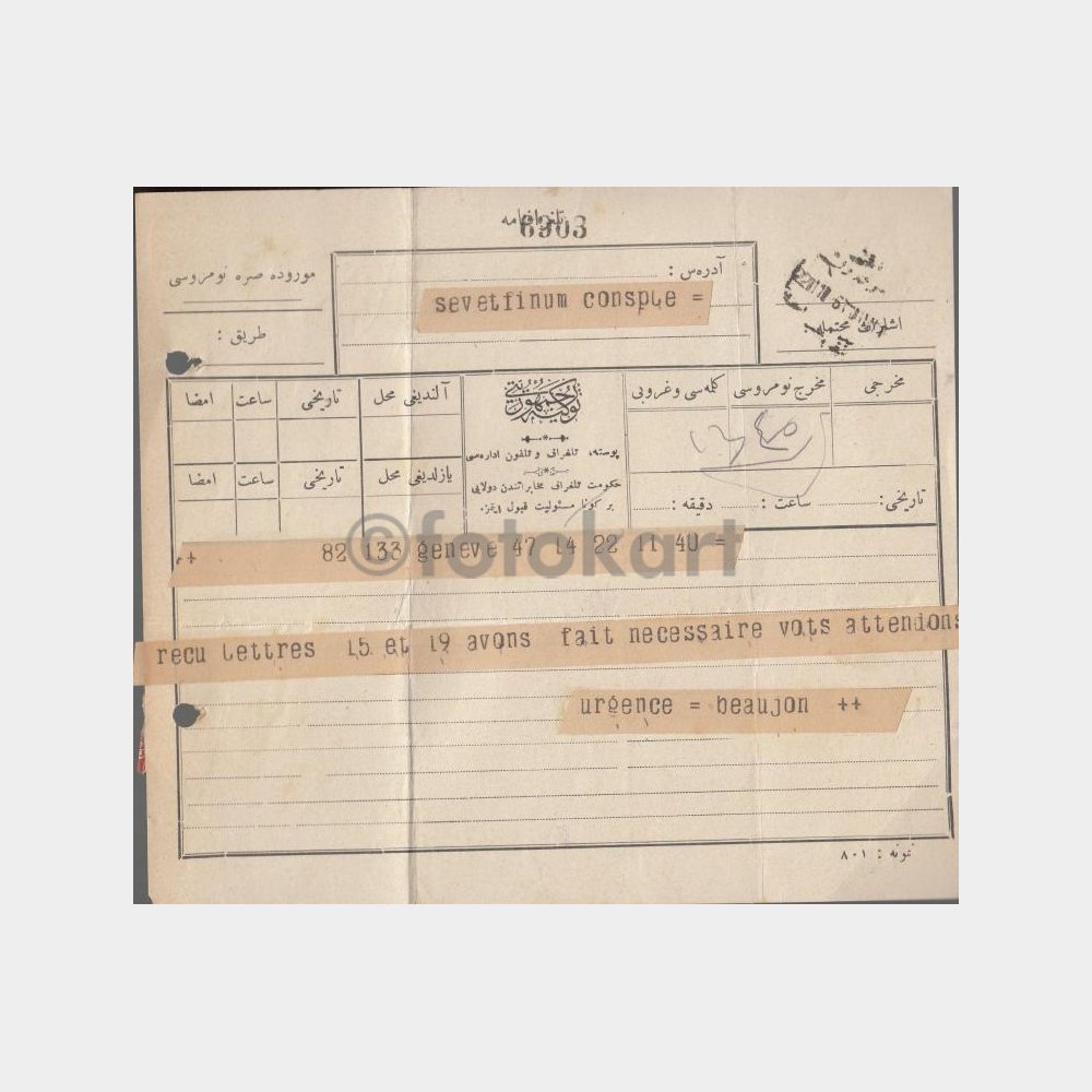 1914 Servetifünun Adresli -Cenevre Çıkış- Telgraf