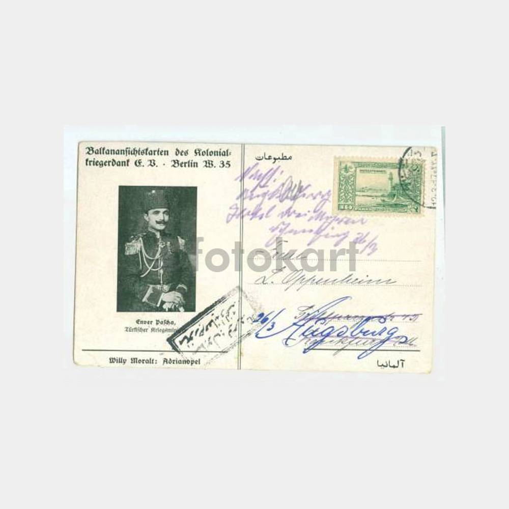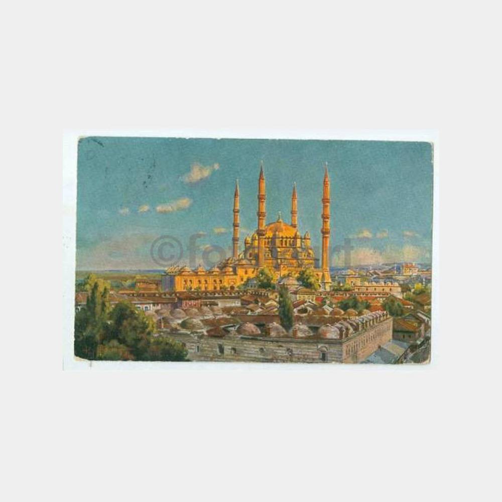 Ön yüzü bir ressamın tablosundan alınma Edirne Selimiye Cami resmi, arka yüzünde 12. 03. 1917 İstanbul posta damgası ve sansür damgası, Ausburg’a gönderilmiş, alman baskısı kartpostal