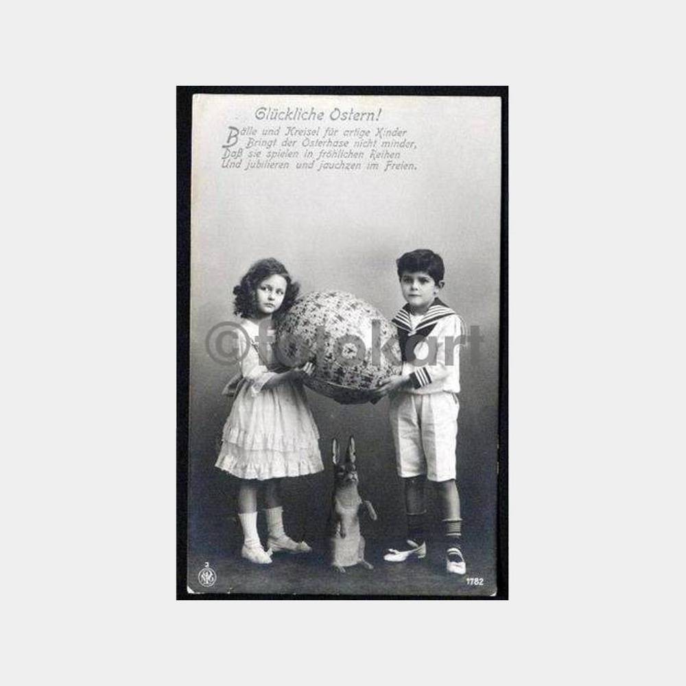 1920’lerde Fransa, Almanya gibi ülkelerde yaygın olarak basılmış çocuk fantazi kartlarından. Çocukların elinde büyük bir paskalya yumurtası bulunuyor.