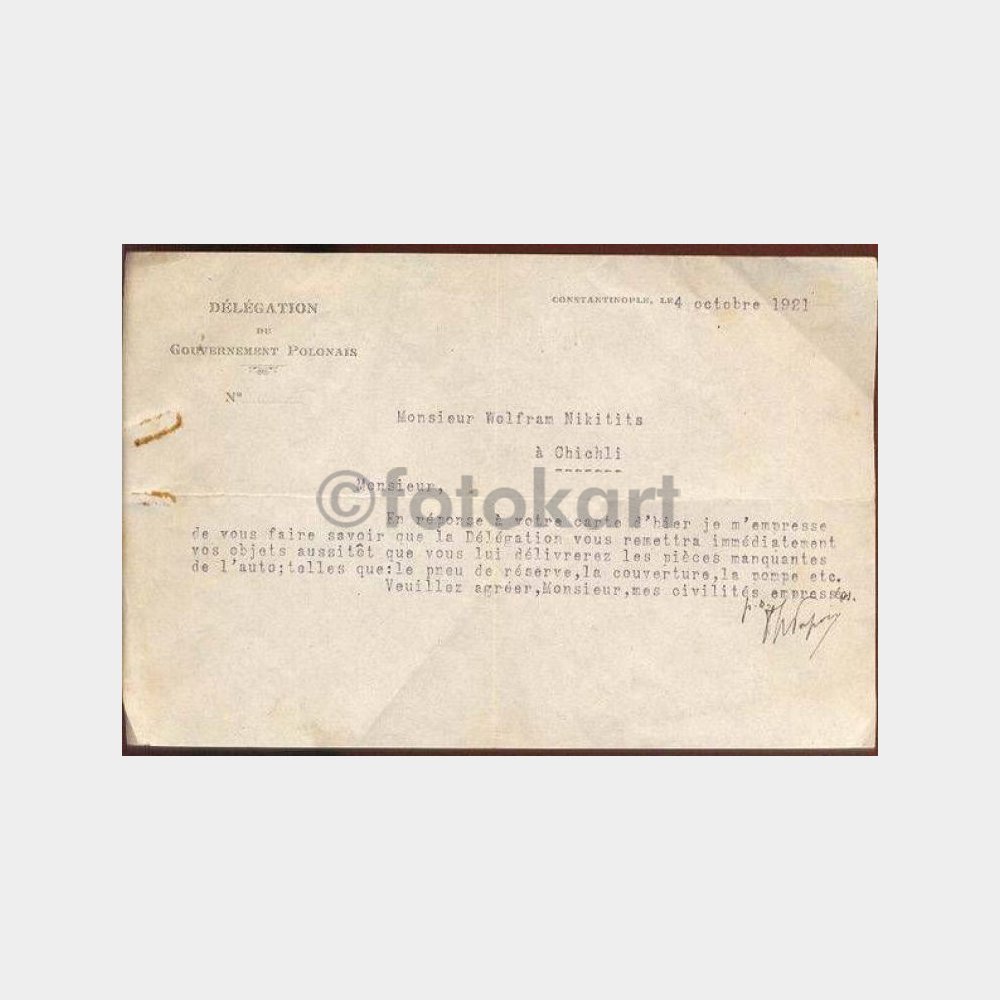 İstanbul 4 ekim 1921 tarihli Polonya hükümeti delegasyonu (Polonezköyde yaşayan polonez asıllı grup ile ilgilenen) Şişli’de Wolfram Nikitits isimli firma sahibinden talep edilen oto makine yedek parça ile ilgili son durumu açıklayan bilgi mektubu.