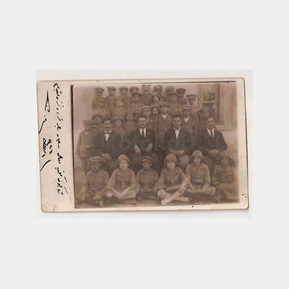 Aynı cins giysi ve şapkaları ile ilginç bir okul grubu fotoğrafı-yan kenarda açıklaması var, arkası boş