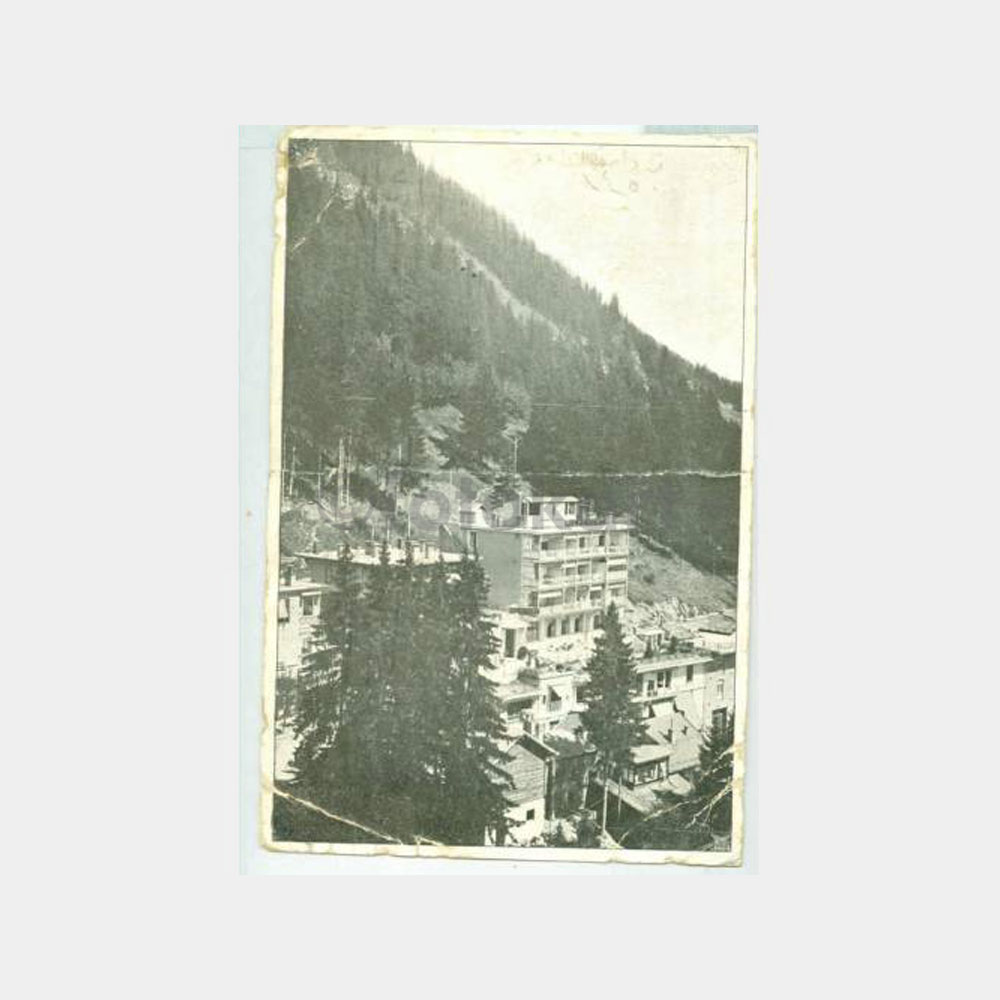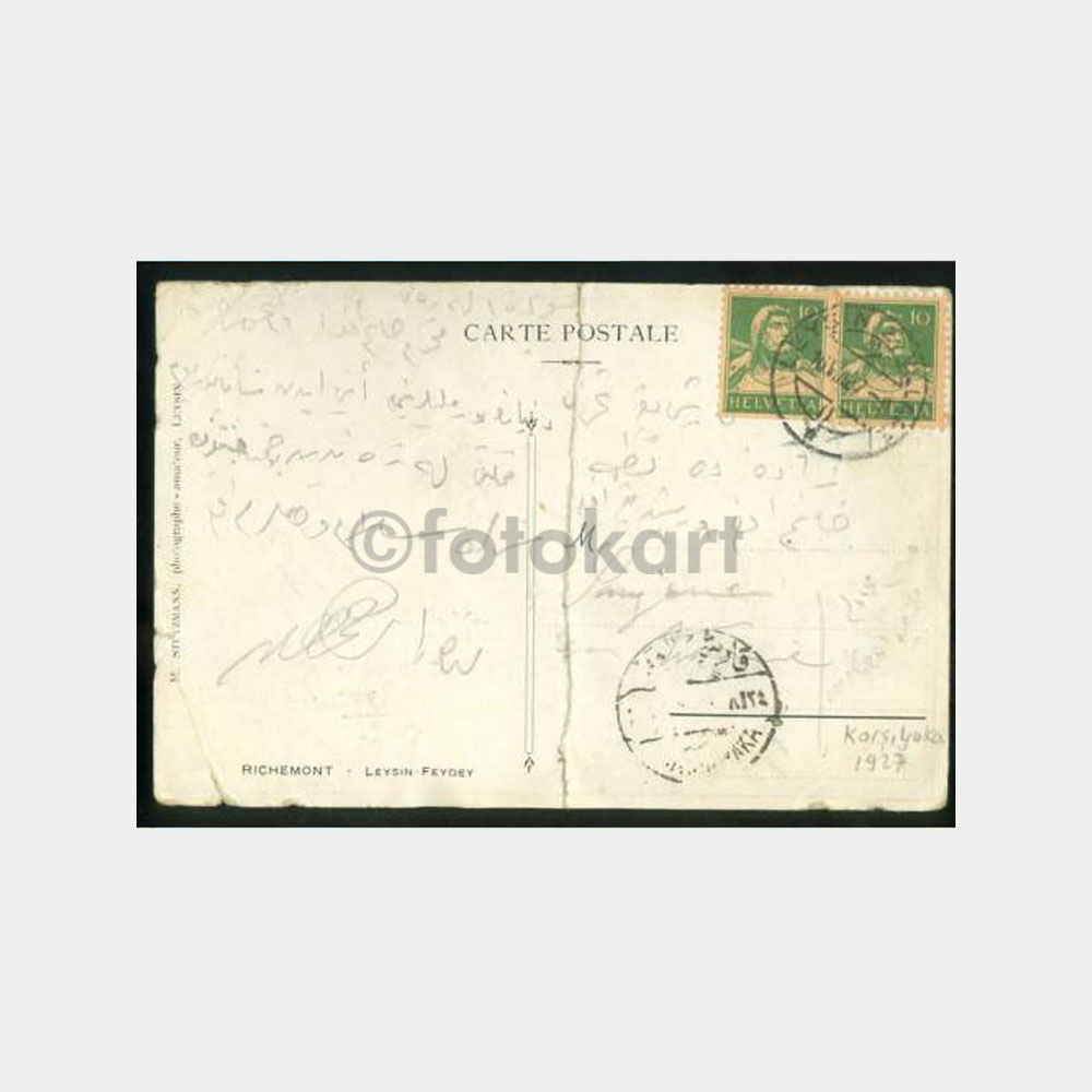 14 x 9 cm ebadında arkası damgalı İsviçre leyşın damgalı Karşıyaka varış damga kart ortası tamirli