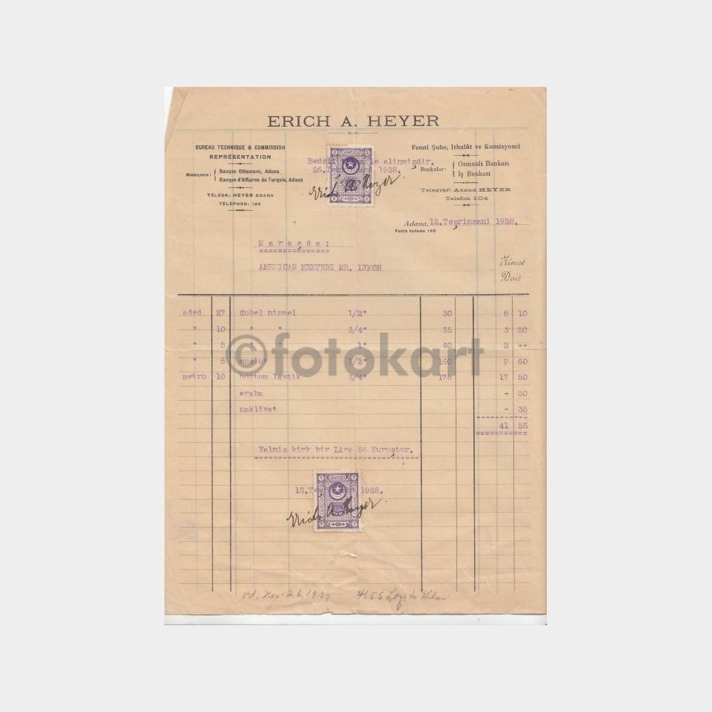 1928 tarihli değerli belgesel faturası. İstanbul Erich Heyer firması. Hortum, lastik, dübel malzeme fat.sı.