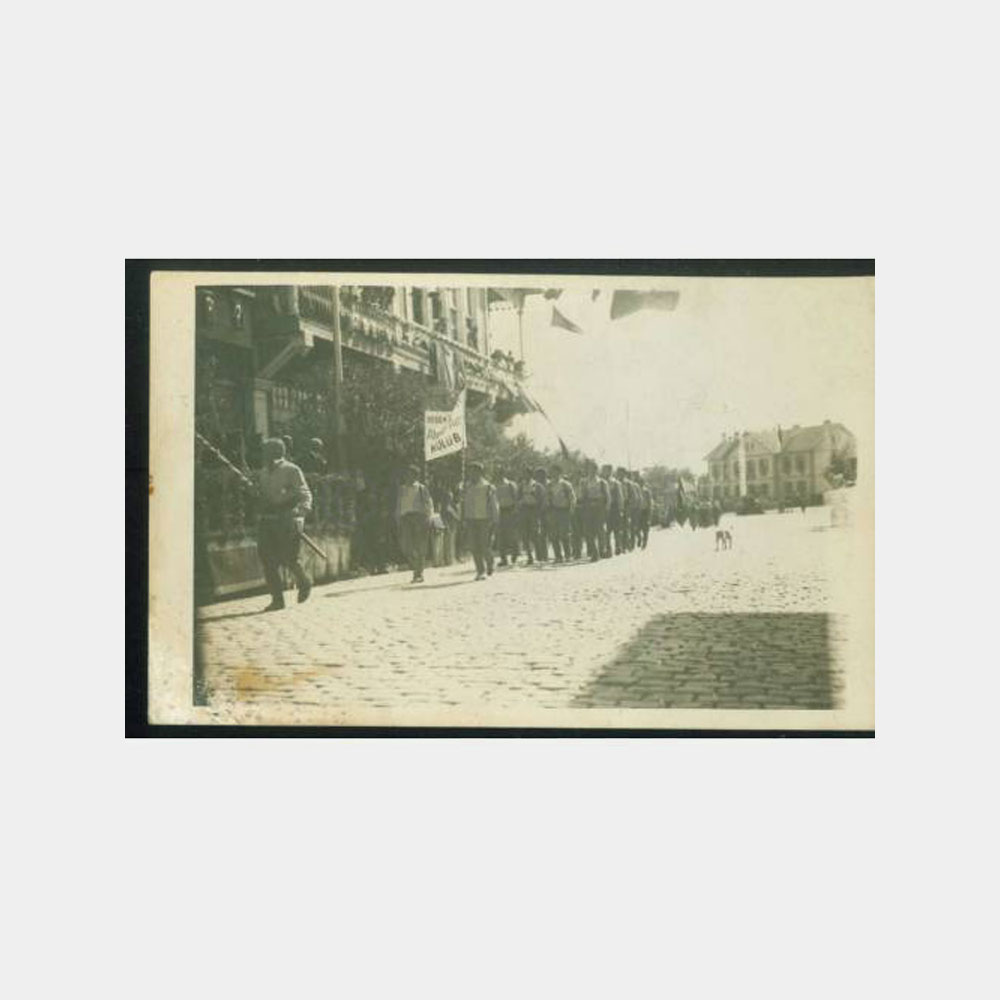 14 x 9 cm ebadında, arkası “Şehir gazinosunda, halk evinde.” yazılı foto. Resimde tören geçidinde grup elinde kulüp yazısı var.