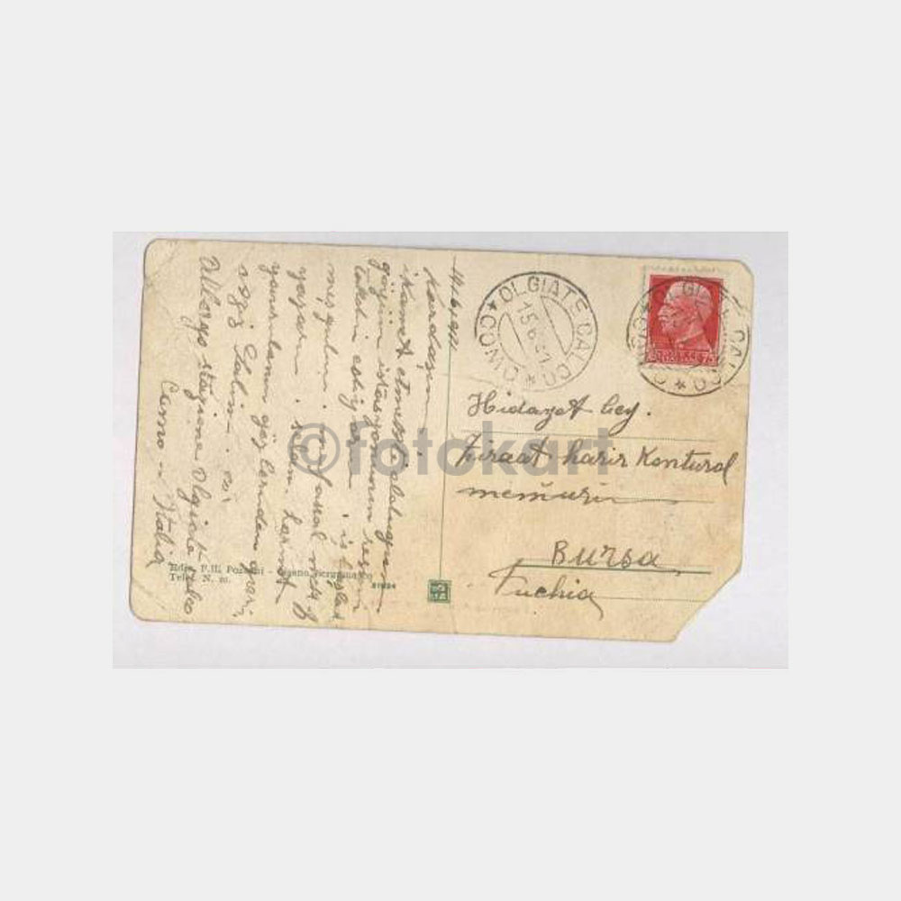 15.06.1931 İtalya’nın en kuzeyinde bulunan Lombardiya bölgesinde bulunan Olgiate Molgora kasabası konulu kart, Hidayet bey Bursa’da ziraat harir (ipek ) kontural (kontrol) memuru adresine gönderilmiş Kondüsyon zayıf haliyle
