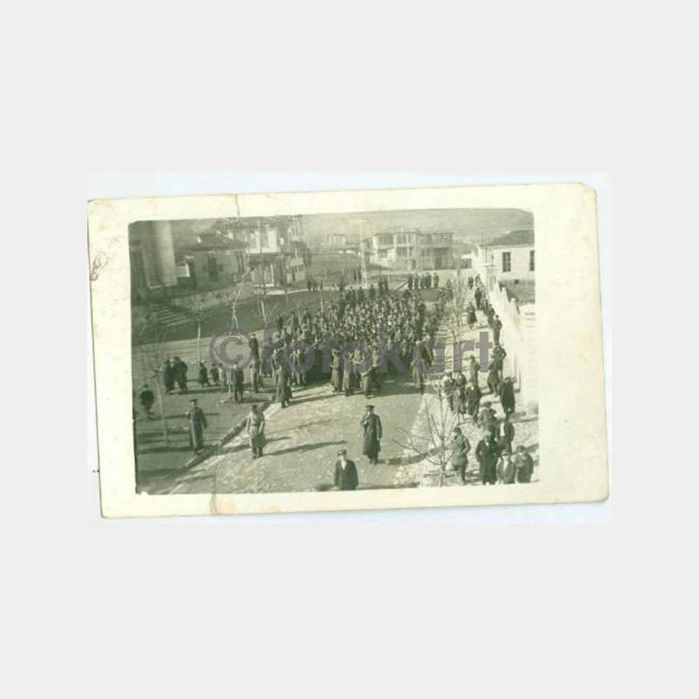 14 x 9 cm ebadında arkası yazılı. Ortadan tamirli albüm fotoğrafı, “27.1.1932 tarihinde vefat eden arkadaşımızın cenaze töreninde” yazılı.