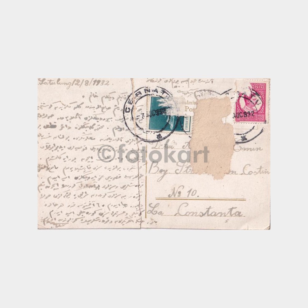 9 x 14 cm, yazılı. Postadan geçmiş-ortadan tamirli.