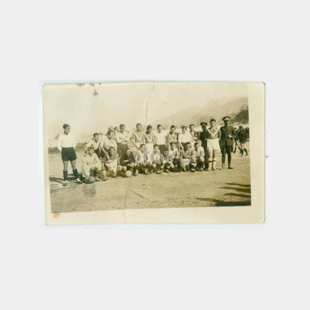 14 x 9 cm ebadında ortadan tamirli haliyle Arkasında mektebimizin birinci takımıyla sanatkarlar birinci takımı arasında yapılan lig maçında, hakemin haksız kararları yüzünden yarıda kaldı yazısı var