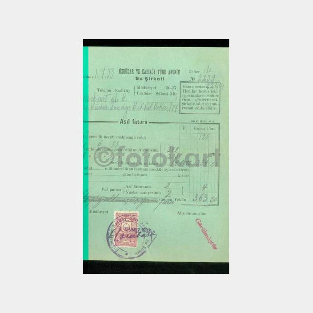 1933 Üsküdar ve Kadıköy Su Şirketi Faturası