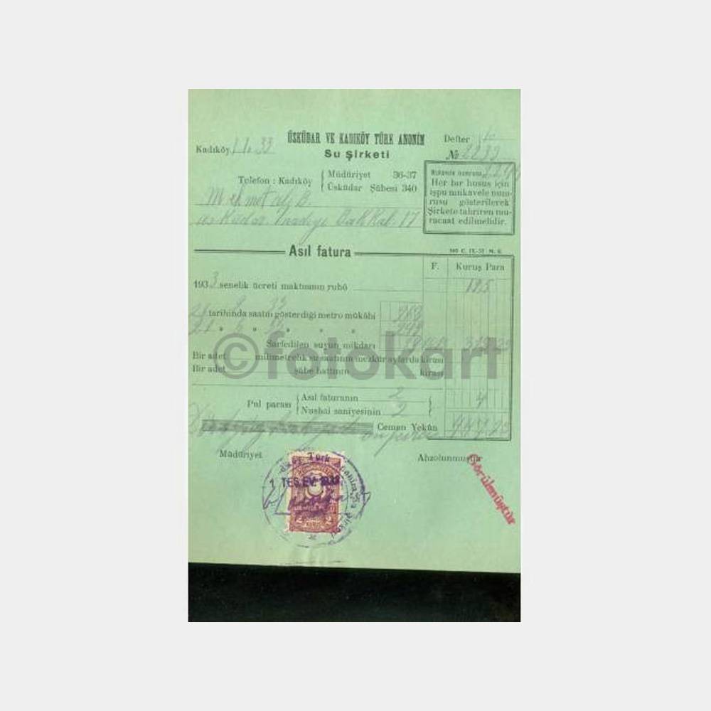 1933 Üsküdar ve Kadıköy Su Şirketi Faturası