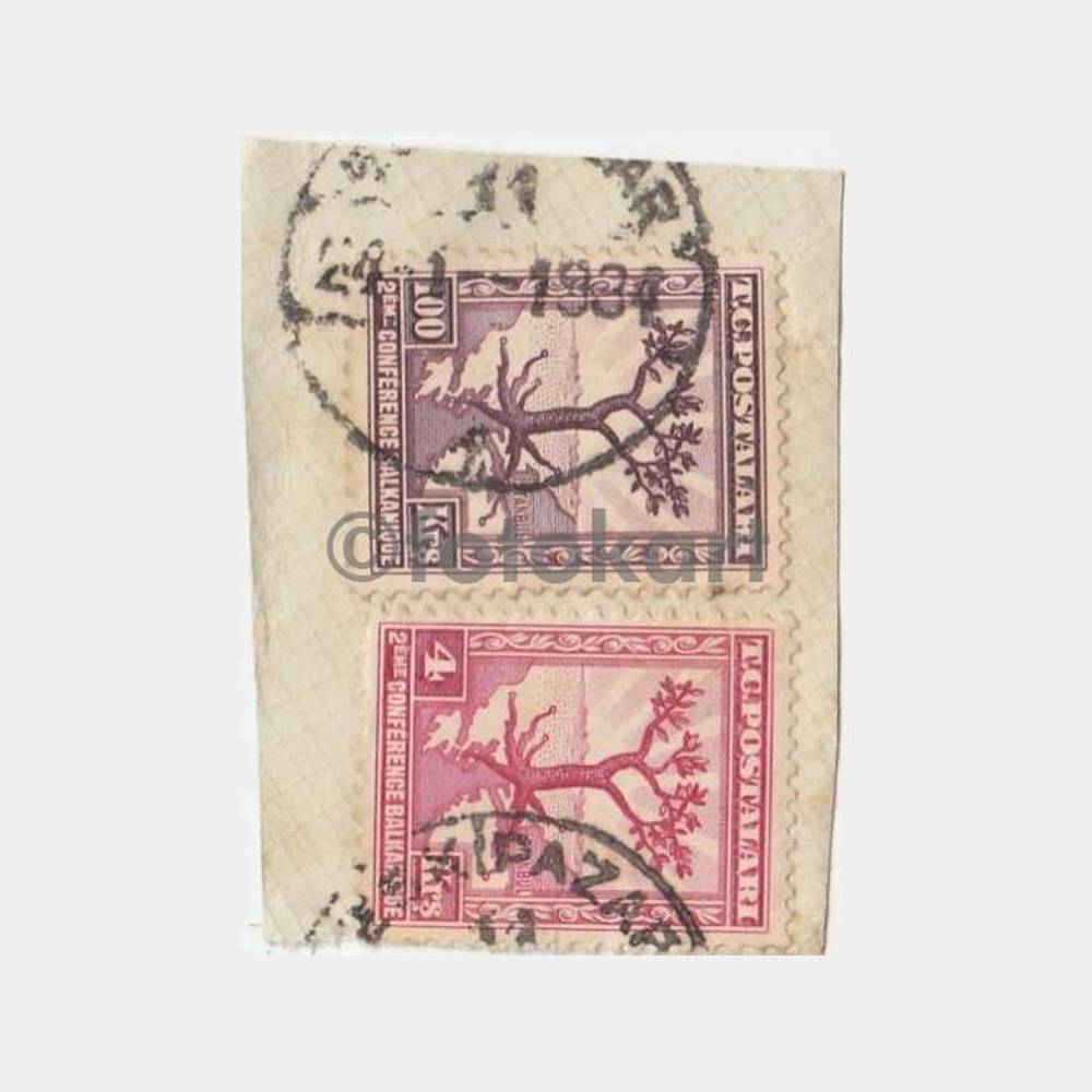 Bir koleksiyondan çıkma zarf parçası kağıt üzerinde damgalarda Eskipazar posta damgası var