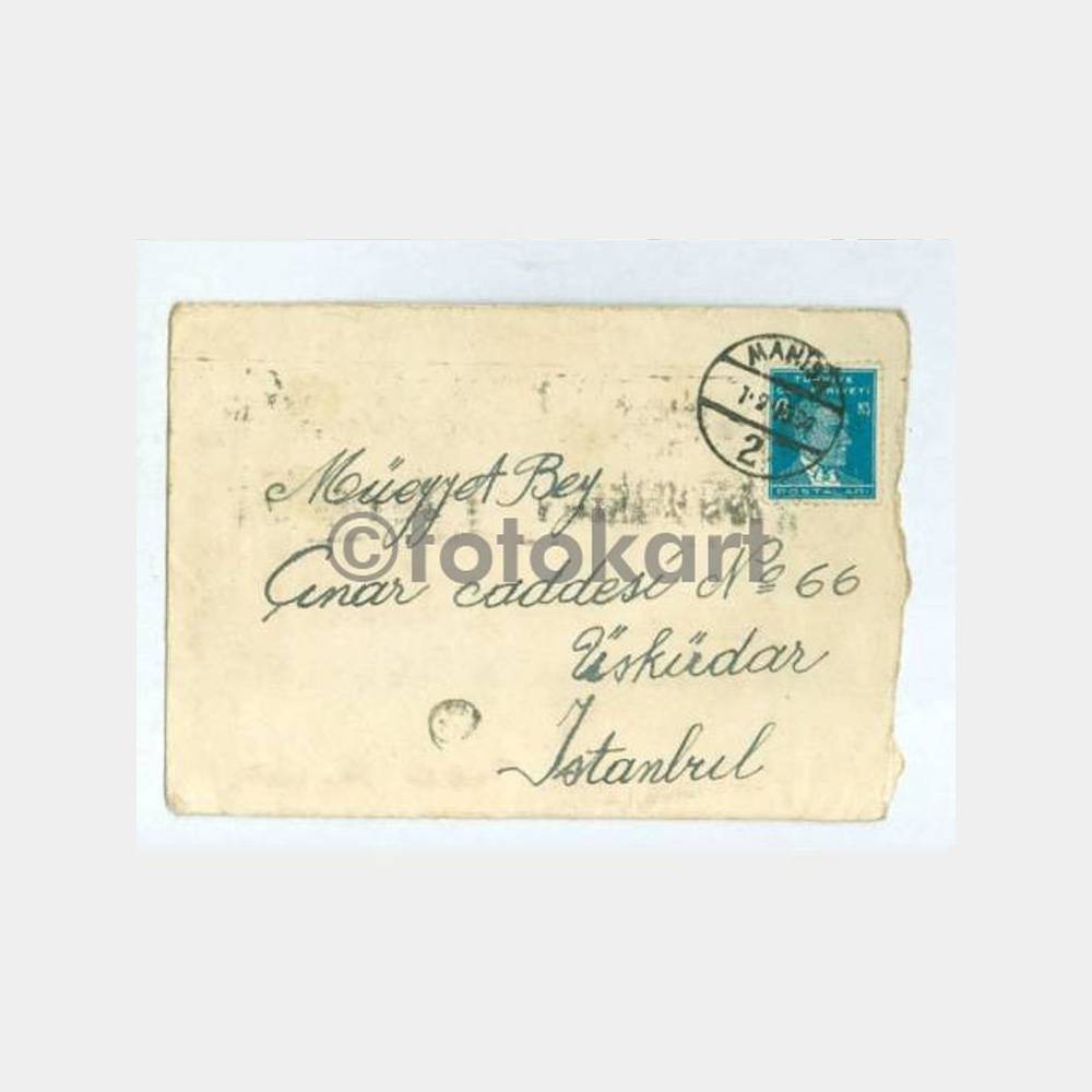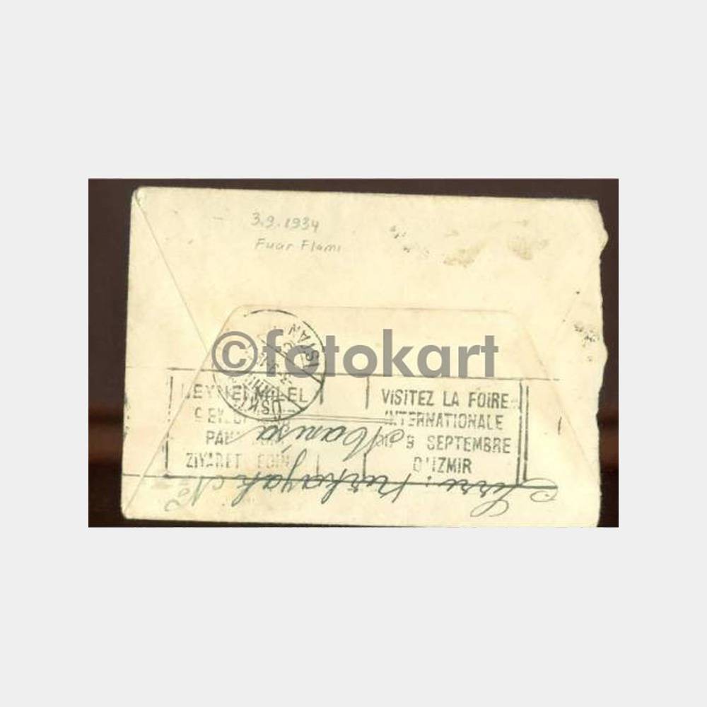Ön yüzünde 01. 09. 1934 Manisa damgası var, arka yüzünde 3. 9. 1934 Üsküdar varış damgası ile, visitez la foire internationale , septembre d’İzmir-beynelmilel 9 eylül İzmir panayırını ziyaret ediniz, flam damgası