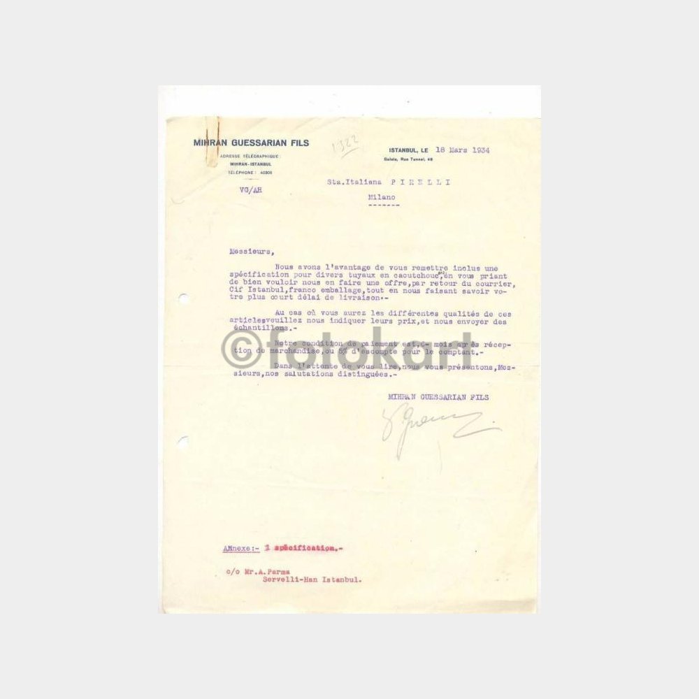 Pera Beyoğlu- Mihran Guessarian Fils 18.3.1934 tarihli Pirelli’ye yazılan yazı.