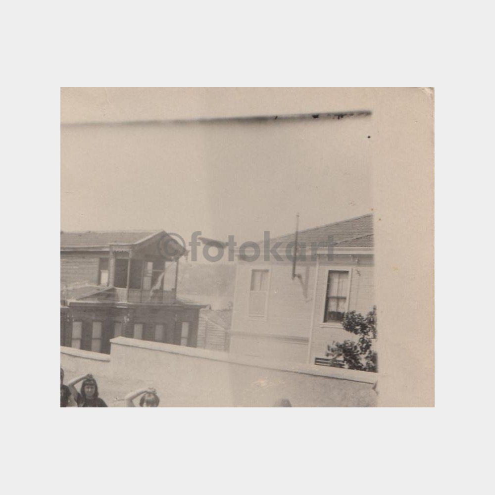14,5 x 19 cm ebadında, arkası yazısız belgesel fotoğraf. Kondüsyon haliyle. Beyoğlu’nda bir okul teras katında kız öğrenciler beden dersinde görünüş.