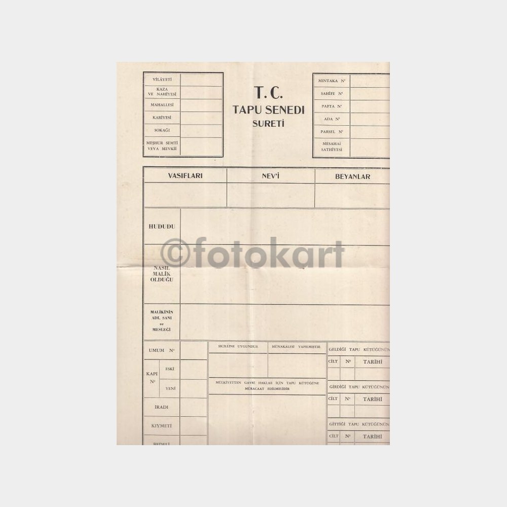 18 x 13 cm ebadında, kapak içinde 2 adet 24 x 34 cm suret kağıdı. Boş durumda, koleksiyon amaçlı eski tapu belgeleri.