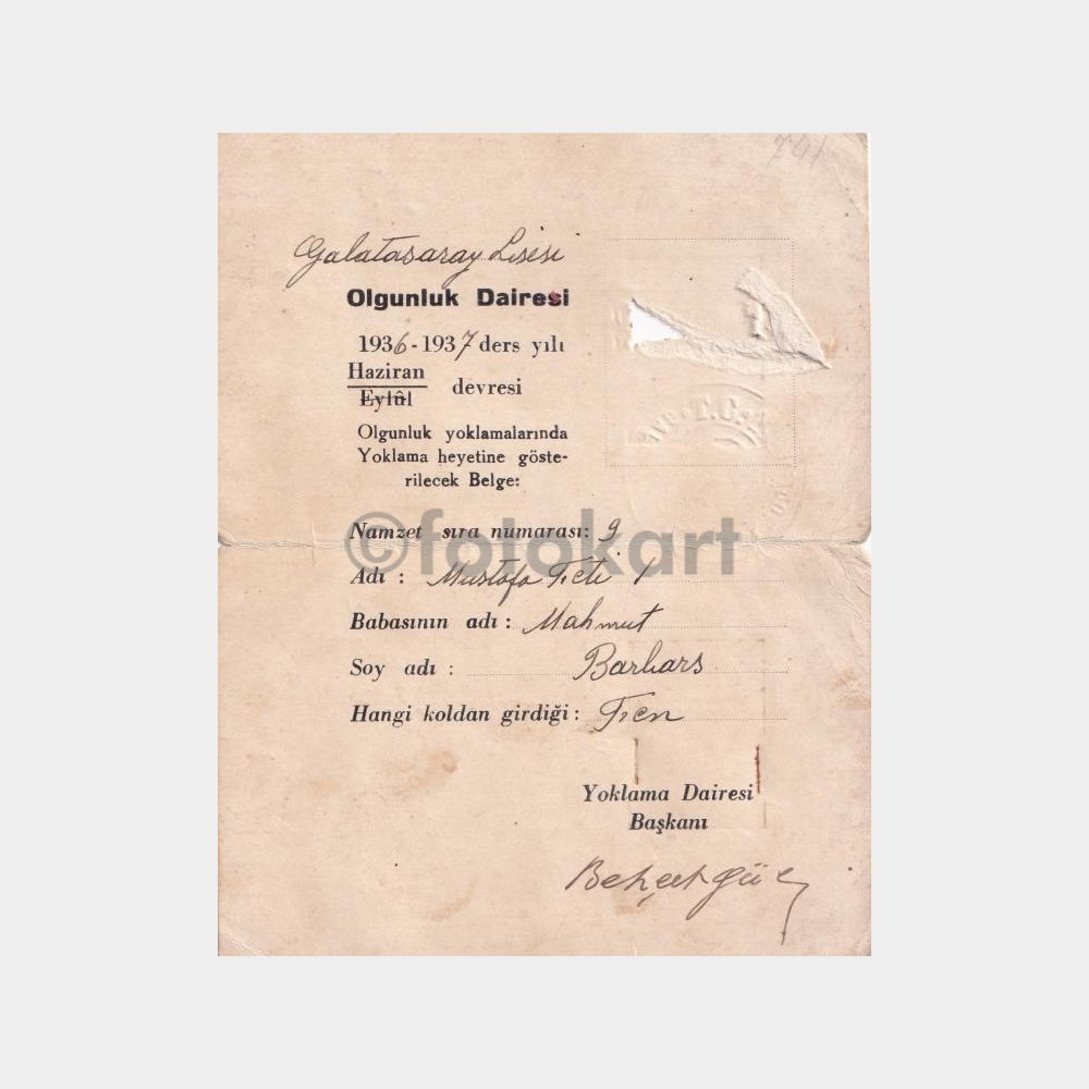 “1936 Galatasaray Lisesi Olgunluk Dairesi Sınav Giriş Kartı” için yorum yapan ilk kişi siz olun Yanıtı iptal et