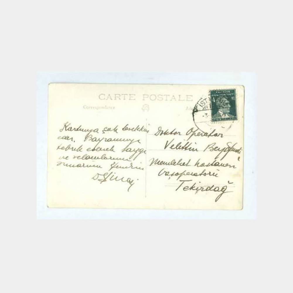 9 x 14 cm ebadında Tekirdağ Memleket Hastanesi baş operatörü Velittin beyefendiye gönderilmiş değerli kart