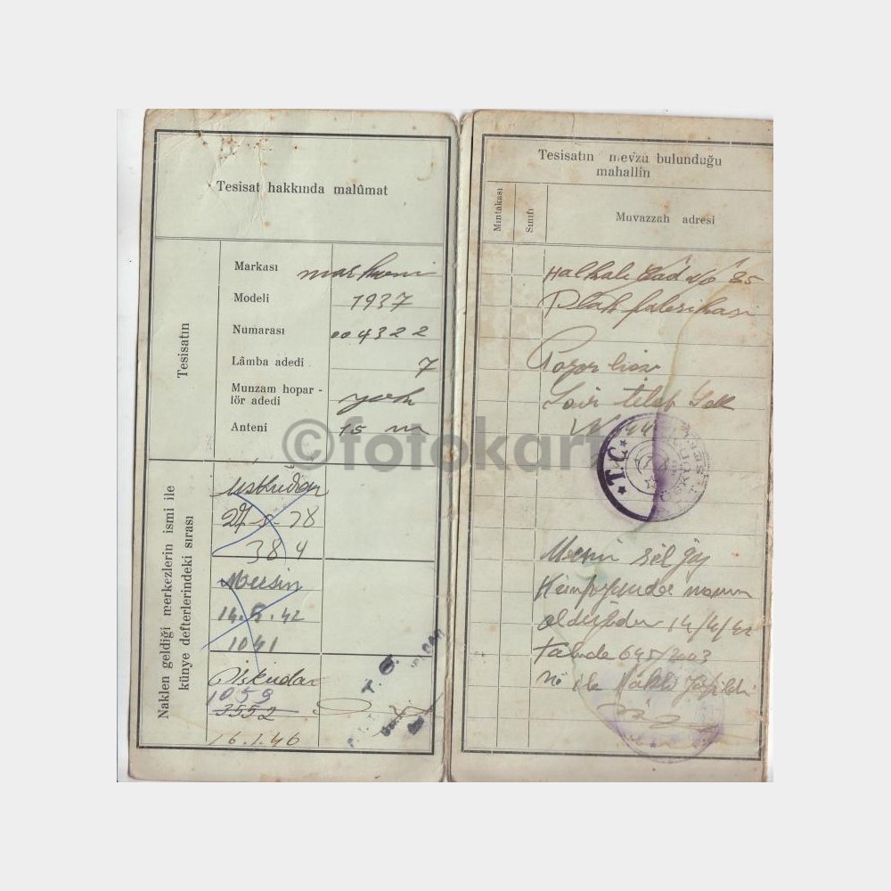 Çok temiz, içi yazılı damgalı nadir radyo ruhsatı. 1937 yılına ait.