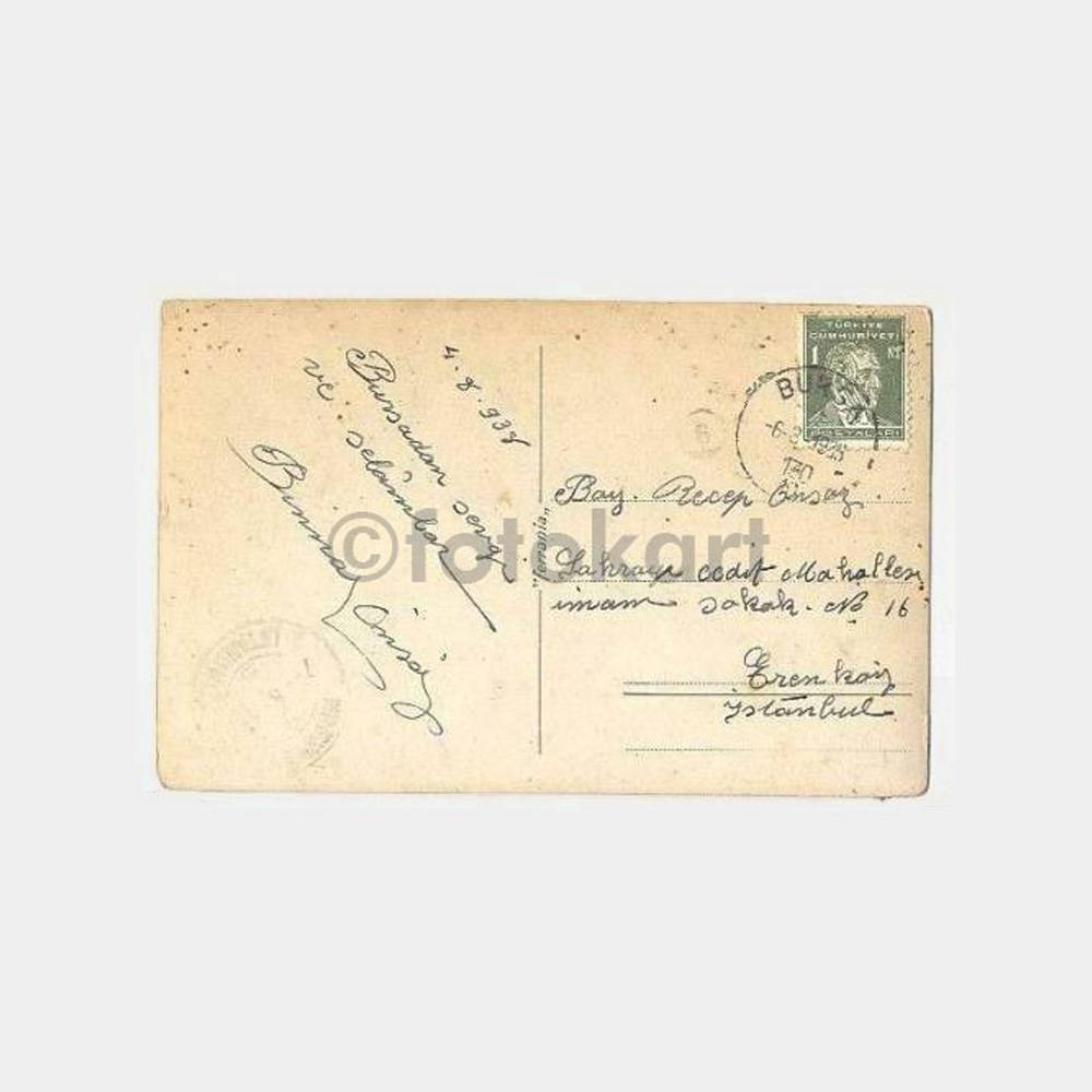 Arkasında 6. 8. 1938 tarihli Bursa, 130 nolu posta damgalı pullu ,yan köşede Erenköy 7. 8. 1938 varış damgalı fotokart