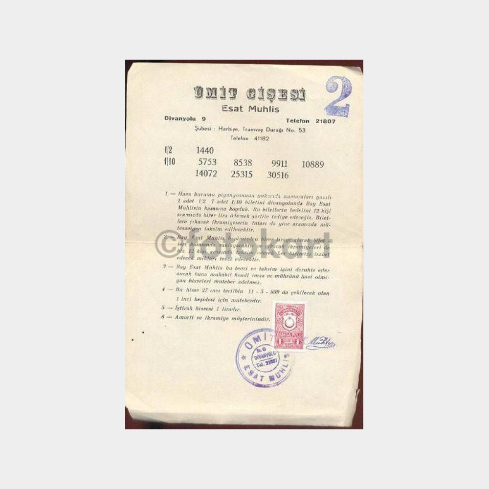 Piyango tarihimiz açısından ilginç belge 11.5.1938’de çekilecek 1. keşidenin 1 liralık ve 12 kişilik iştirak hissesi-Esat Muhlis Divanyolu. Listelerin herbiri birbirinden farklıdır.