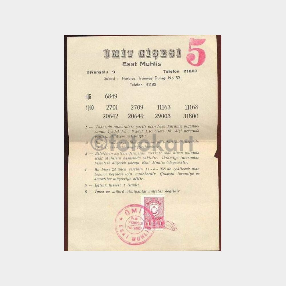 Piyango tarihimiz açısından ilginç belge. 11.3.1938’de çekilecek 5. keşidenin 1 liralık ve 15 kişilik iştirak hissesi-Esat Muhlis Divanyolu. Listelerin herbiri birbirinden farklıdır.