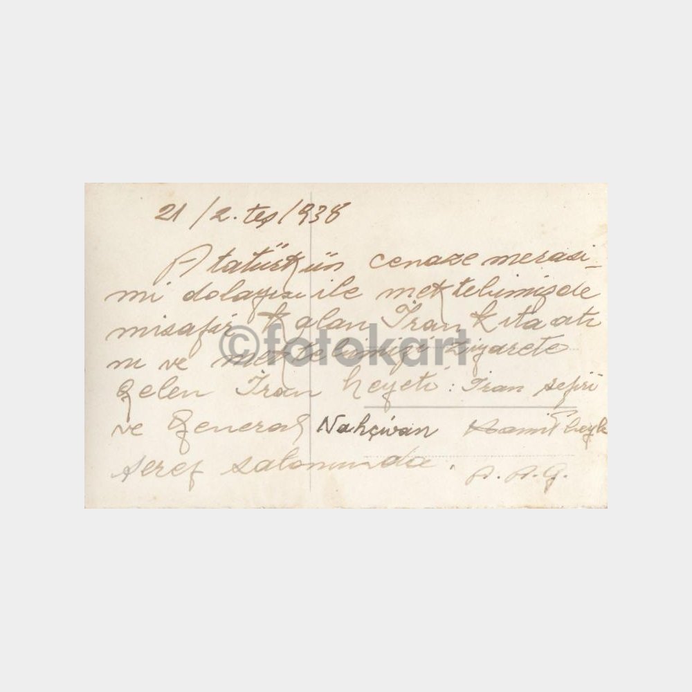 14 x 9 cm ebadında, arkası yazılı belgesel fotoğraf. Kondüsyon iyi. Atatürk’ün cenaze merasimine gelen yabancı misafırler grubu.
