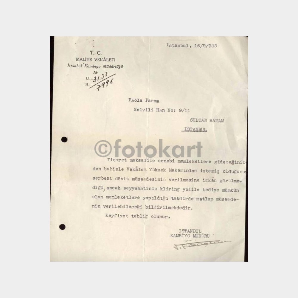 1938 Maliye Vekaleti Döviz Yasağı Yazısı