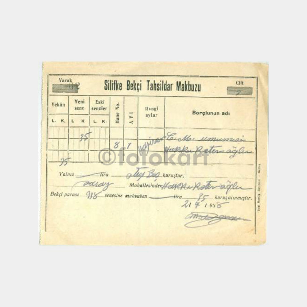 1938 Silifke Bekçi Tahsildar Makbuzu