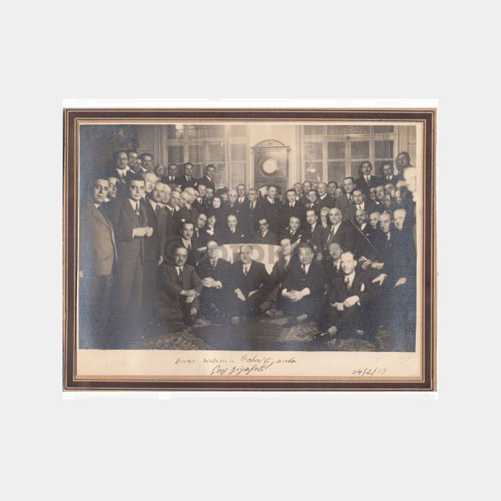 Belgesel fotoğraf. Fahrettin Kerim Gökay görülmektedir ve diğer ünlü hukuk adamları mevcut. Ünlü Tokatlıyan Oteli salonunda çay ziyafeti. 19.2.1939.