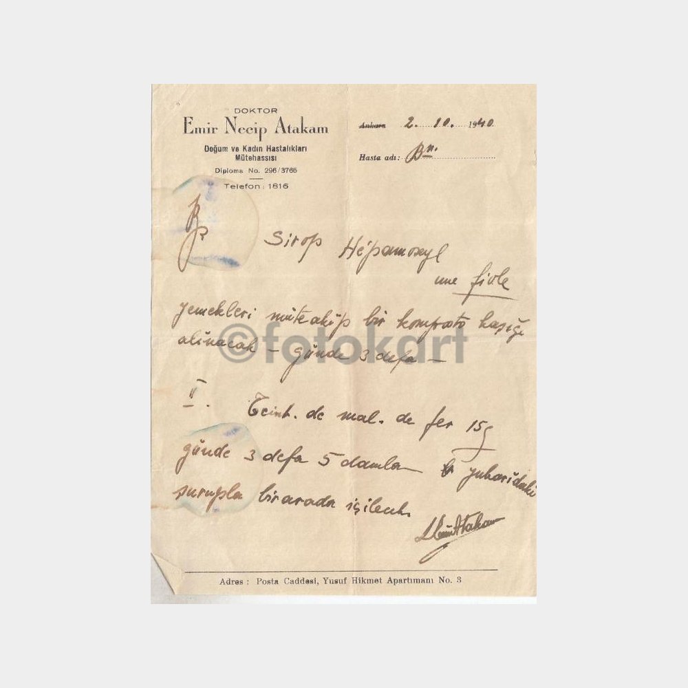 1940 Dr. Emir Necib Atakam Reçetesi (Çok Nadir)