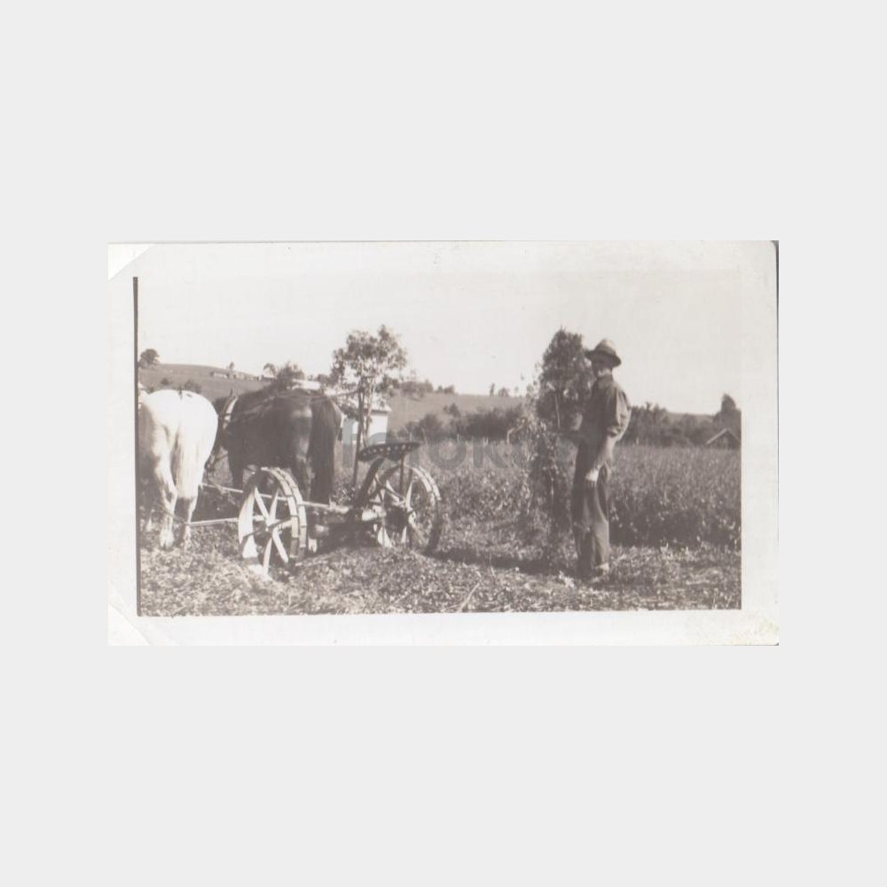 7 x 11 cm ebadında, arkası yazısız belgesel fotoğraf. Bir çiftçi, atlara bağlı toprak sürücü aletiyle tarla sürerken görülüyor.