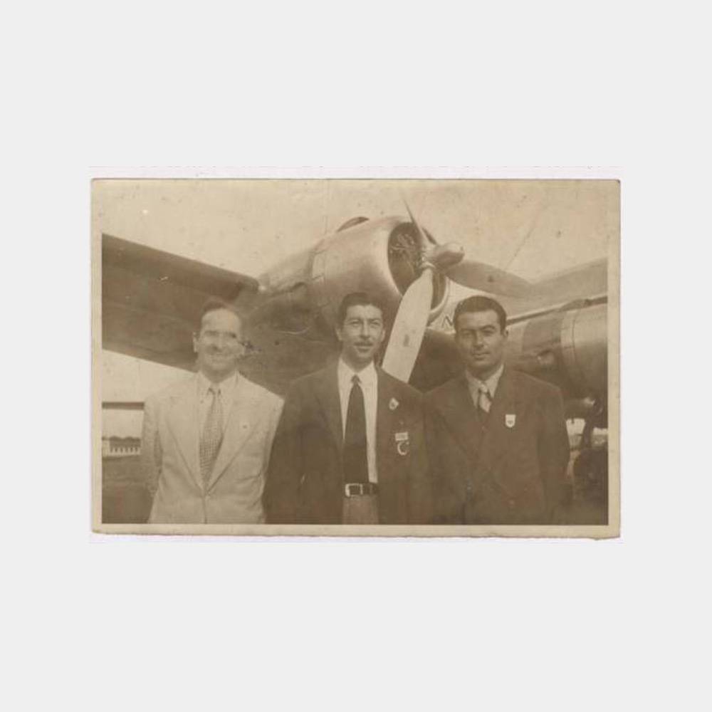 12 x 18 cm ebadında arkası yazısız, bir uçak önünde ceket göğüs kokartı olarak türk bayrak ve olimpiyat resimli görünüş,