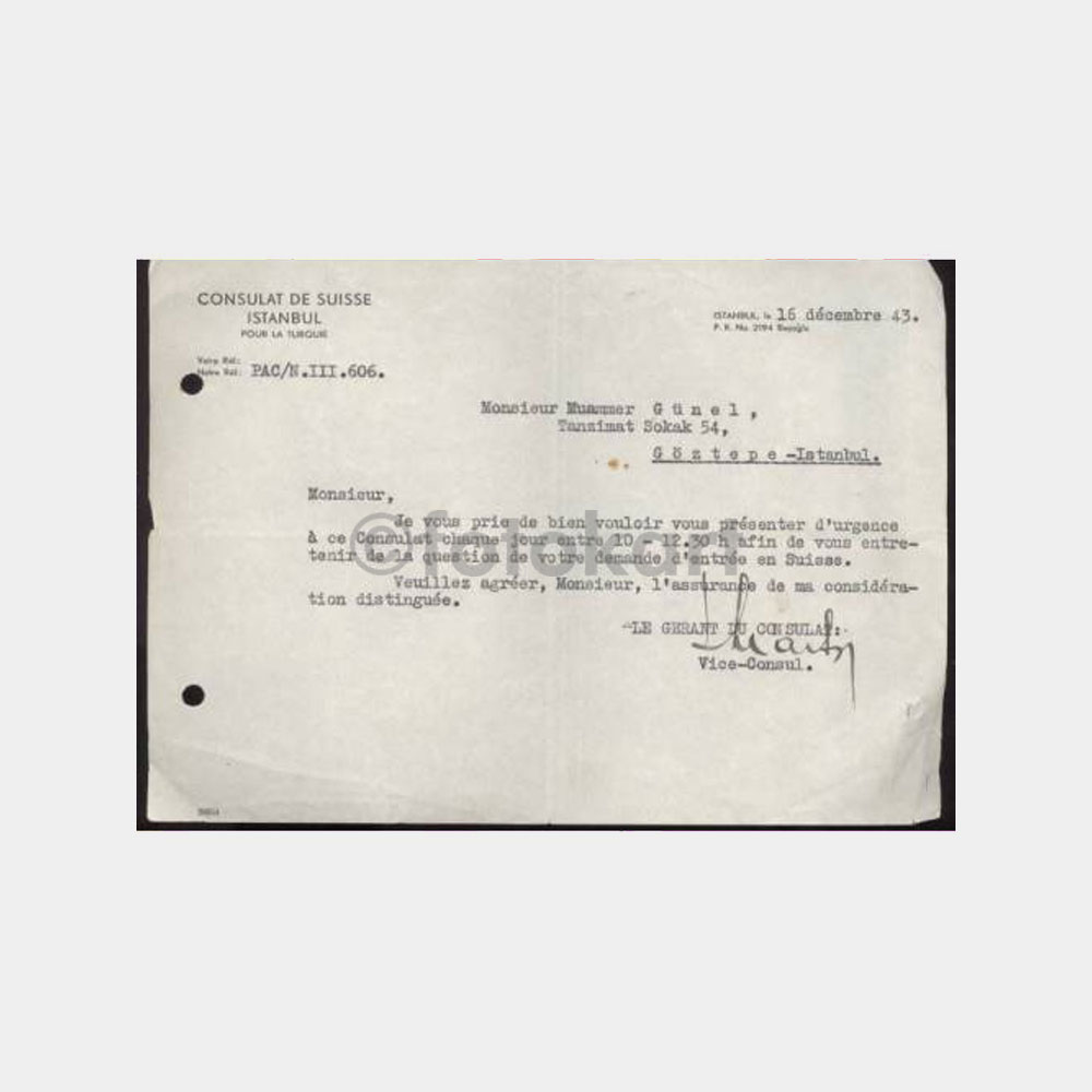 1943 İsviçre-İstanbul Konsolosluk Yazısı