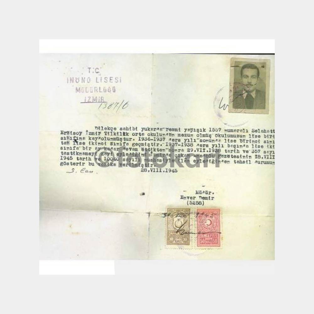 1945 İzmir İnönü Lisesi Tahsil Vesikası Belge