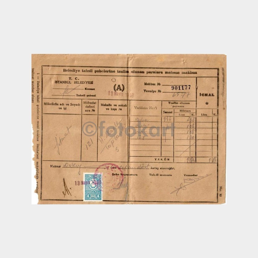 1946 Fener Şubesi Vergi Makbuzu