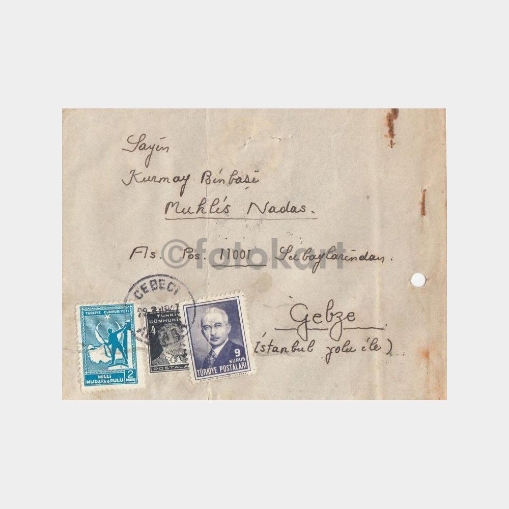 Damgalı pullu bir adet zarf. Gebze askeri posta 11001 nolu adres ve varış damgası.