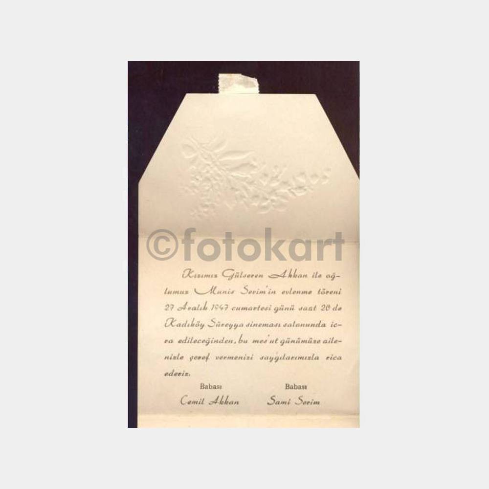 27. 12. 1947 Munis Serim ile Gülseren Akkan nikah töreni Kadıköy Süreyya sineması salonlarında, davetiye