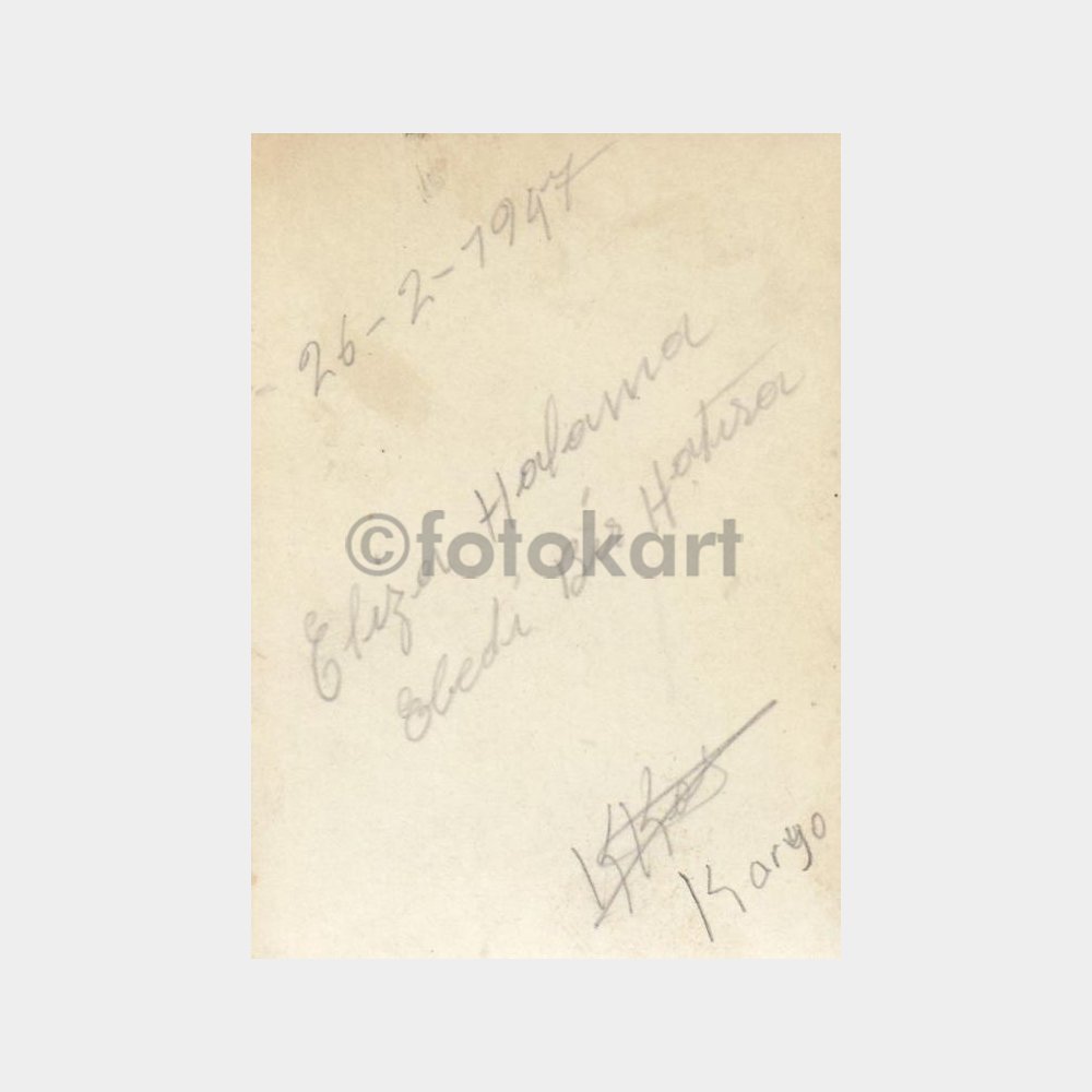 9 x 6 cm ebadında, arkası “Eliza halama Karyo” yazılı belgesel fotoğraf. Kondüsyon iyi.