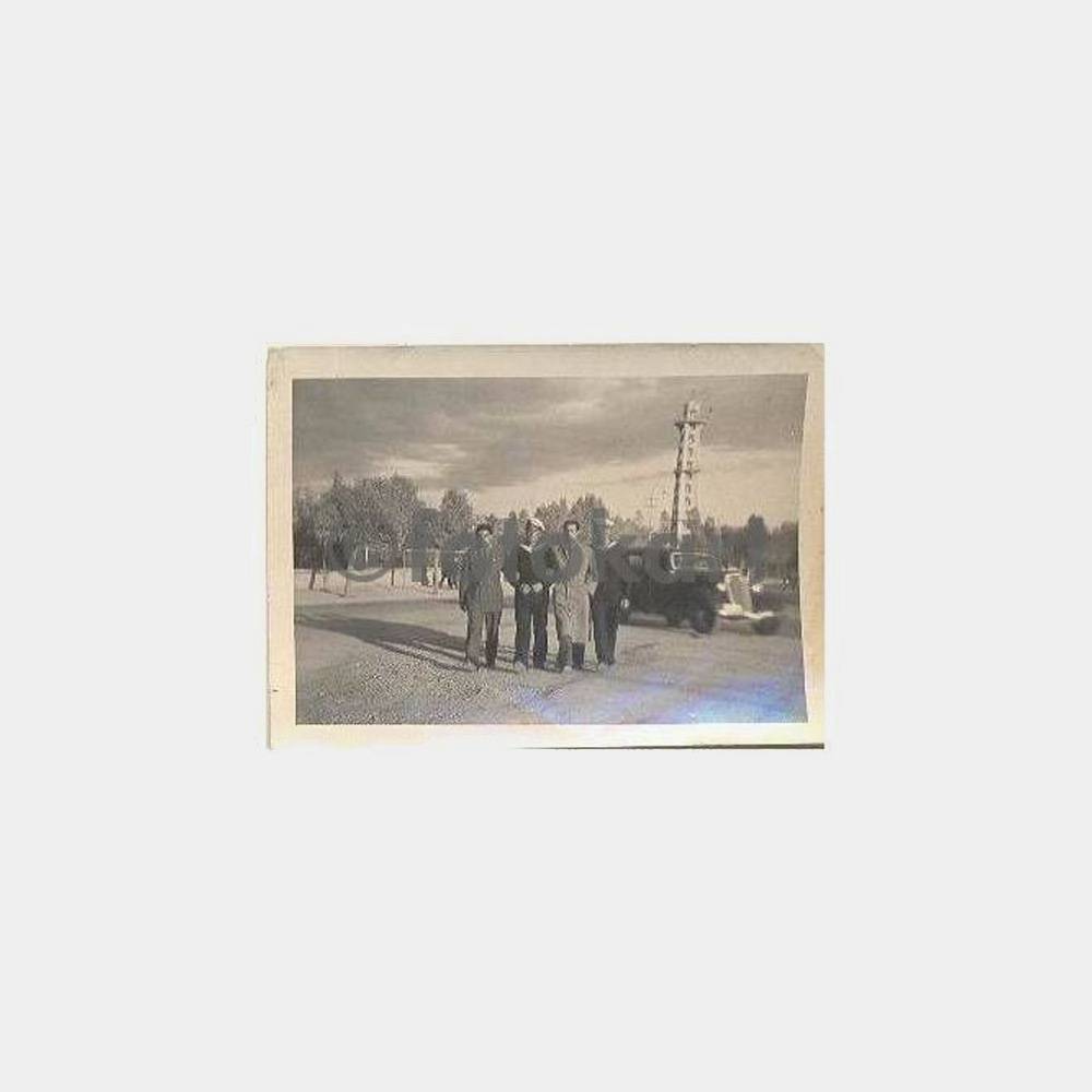1948 Ankara paraşüt kulesi önünde fotoğraf, 6 x 9 cm ebadında, arkası imzalı, eski model otomobil önünde iki denizci ve arkadaşları küçük ebat fotoğraf.