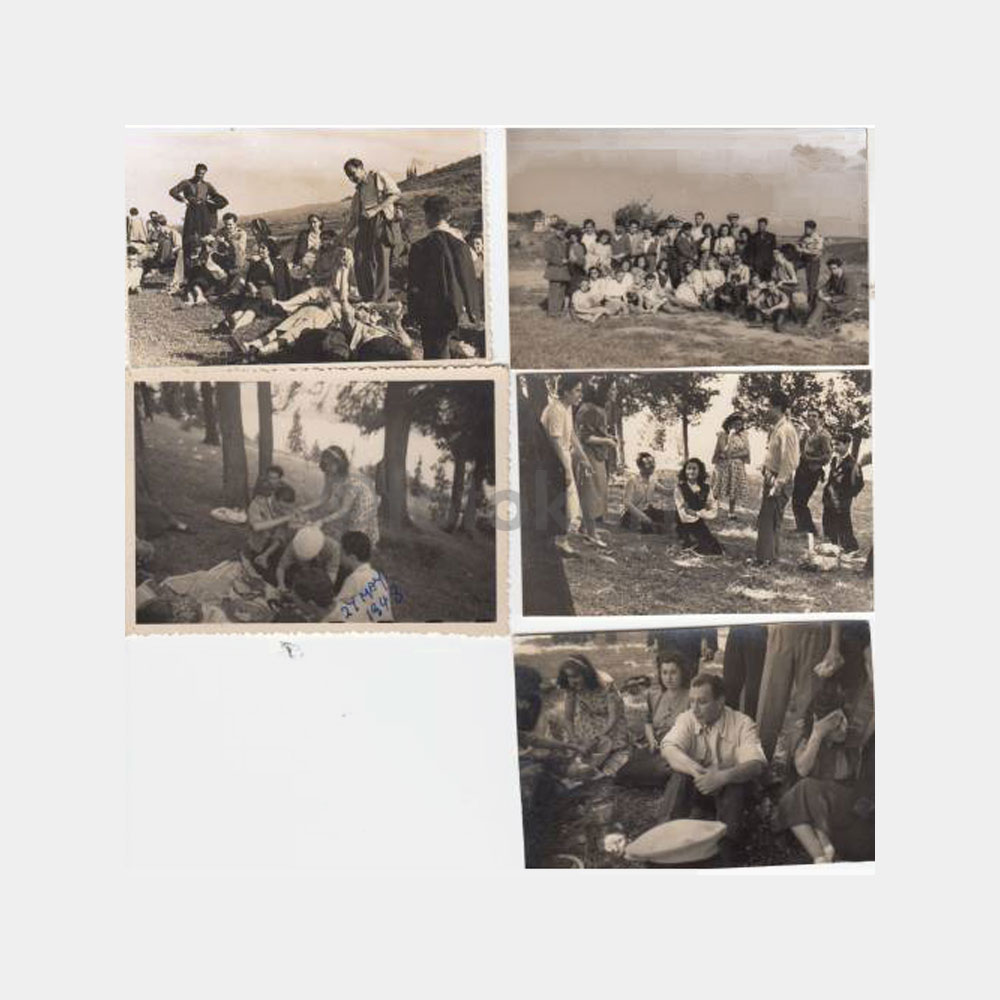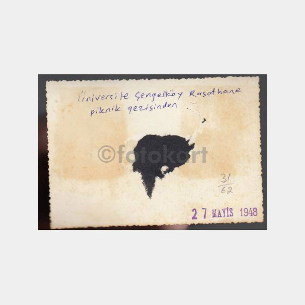 10,5 x 7,5 cm ebadında, arkası biri yazılı, diğerleri tarihli 27.5.1948 6 adet foto. Üniversite öğrencilerinin piknik ve rasathane gezisi görünüşü var.