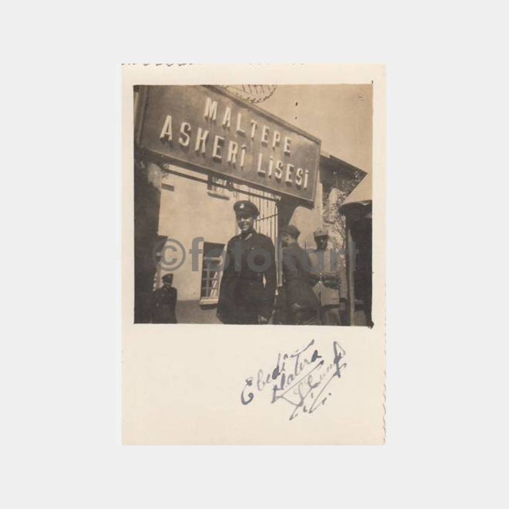 9 x 6 cm ebadında, arkası yazılı 1 adet fotoğraf. Askeri öğrenci okul kapısında.
