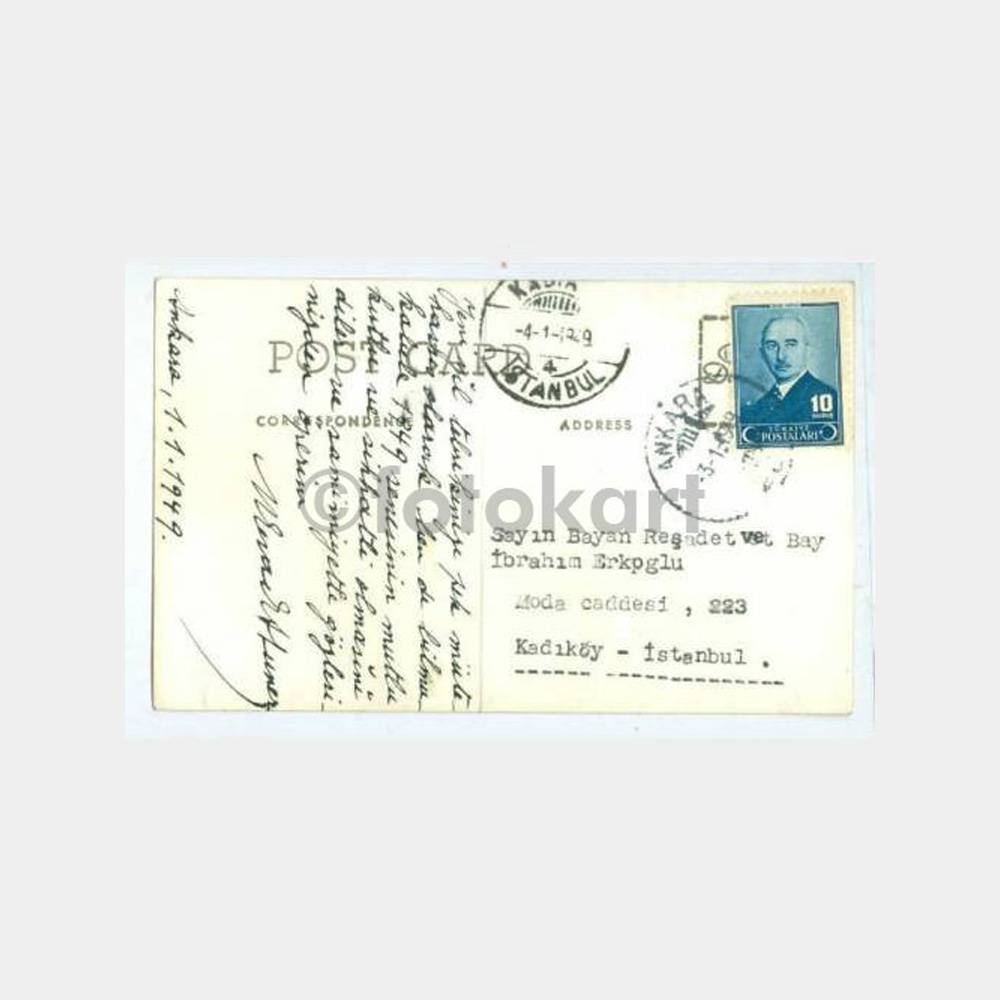 Arkası yazılı pullu ve damgalı nadir kartpostal-Ankara 3. 1. 1949 tarihli